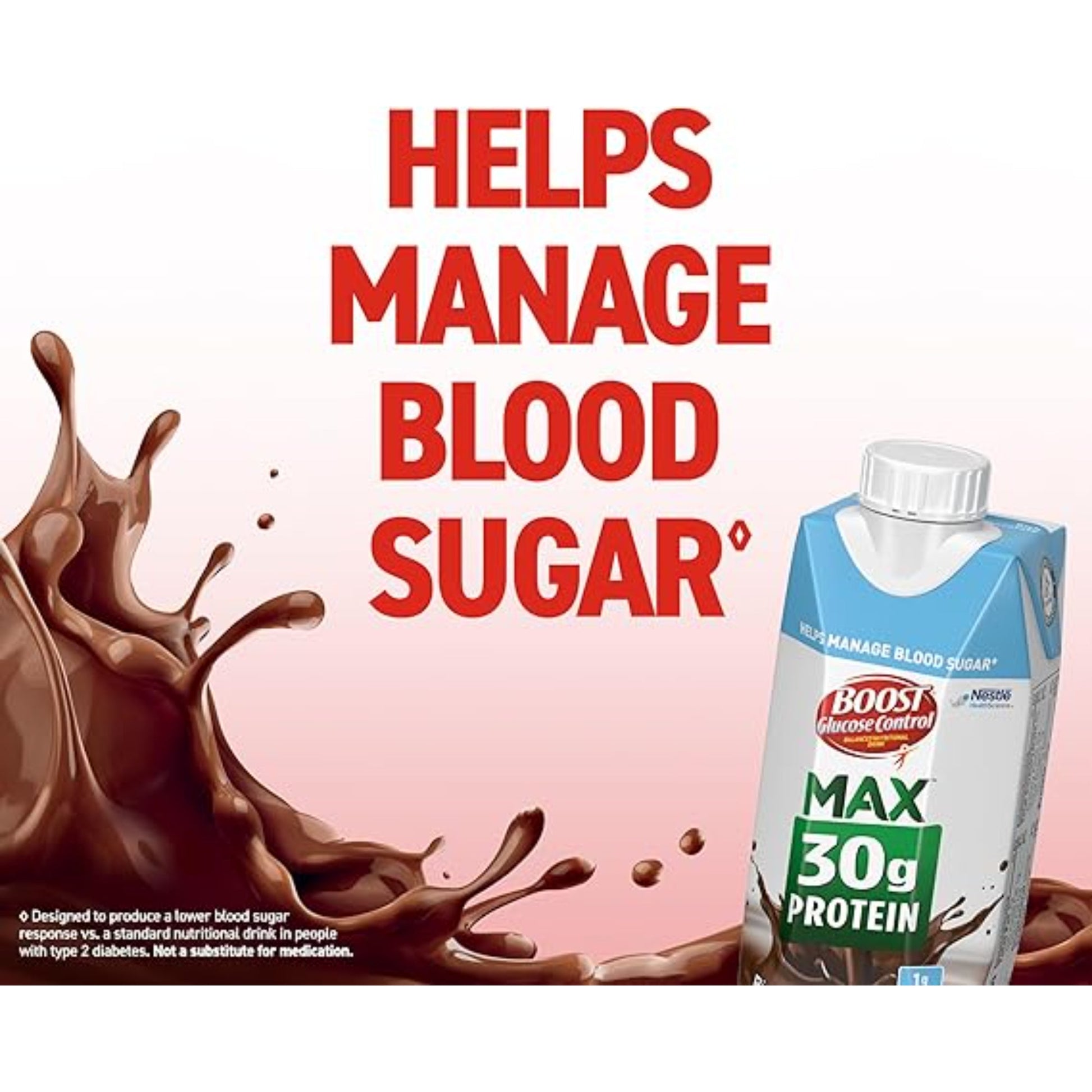 BOOST Glucose Control Max 30g Protein Rich Chocolate Flavored Nutritional Drinks are high protein drinks specially formulated with a blend of protein, carbs and fat to help people with diabetes manage blood sugar levels as part of a balanced diet.(1) This rich chocolate protein drink provides 25 vitamins and minerals and 30 grams of high quality protein per serving to help manage hunger and support lean muscle. Not only does each nutritional shake have Vitamins C & D, zinc, iron and selenium for immune support, but these ready to drink protein drinks also provide 160 nutrient-rich calories with 6 grams of carbs, including 1 gram of sugars. This pack of protein shakes includes four reclosable 11 fluid ounce bottles for easy storage and taking on the go. Whether you want extra protein, less sugars, more calories, fewer calories or simply great nutrition for everyday living, there are BOOST nutrition drinks that fit your needs.(1) Incorporate BOOST Glucose Control Max 30g Protein Nutritional Drink into a balanced diet as part of a medically supervised diabetes management plan. NOT A SUBSTITUTE FOR MEDICATION.