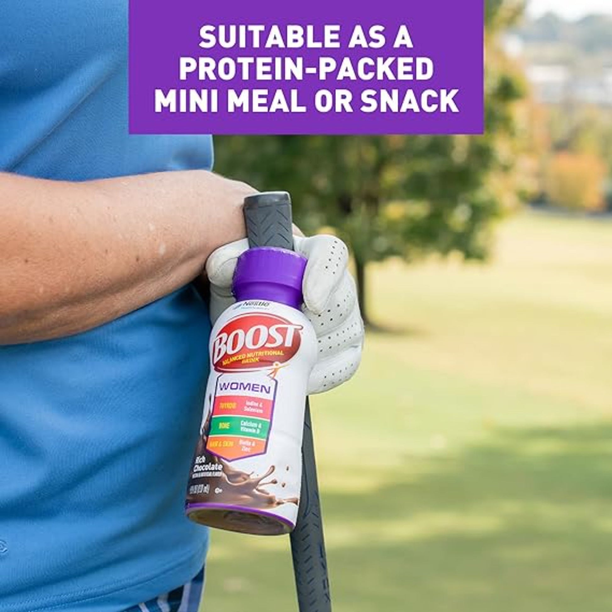Key Benefits of BOOST Women Rich Chocolate flavor Complete Nutritional 8 fl oz Drink: 180 Nutrient-Rich Calories, and only 4 g of total Sugar - The benefits of a nutritional drink while being smart about the calories and sugar. 24 Essential Vitamins & Minerals - Nutrition you need each day, 15 g High-Quality Protein - To help maintain muscle, Low in Saturated Fat - With 7 g of total fat, just 1 g saturated fat, and 10 mg cholesterol per serving, Calcium and Vitamin D - To support strong bones