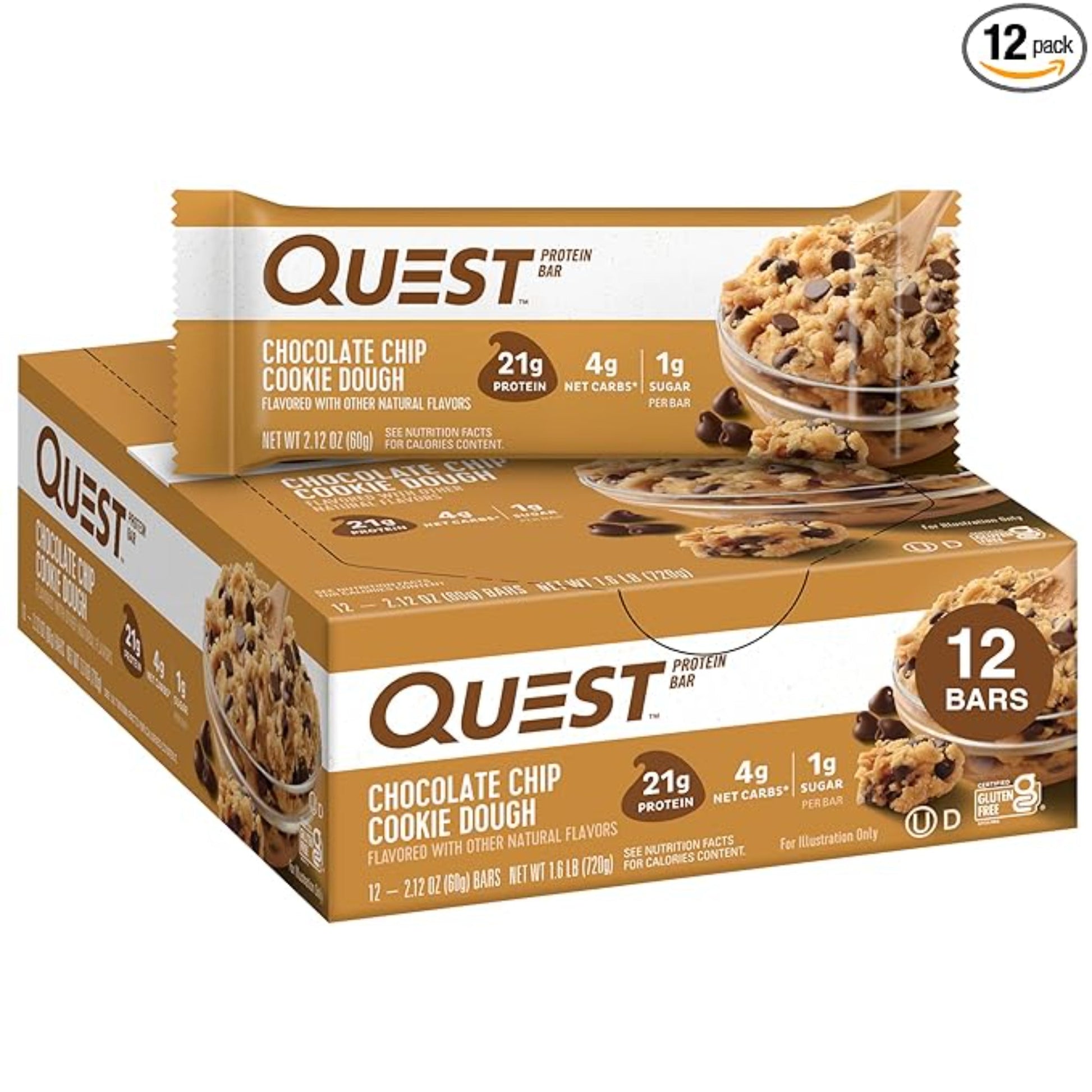 Quest Nutrition Protein Bar, Chocolate Chip Cookie Dough, 21g Protein, 4g Net Carbs, 200 Cals, High Protein Bars, Low Carb Bars, Gluten Free, Soy Free, 2.1 oz Bar, 12 Count.
